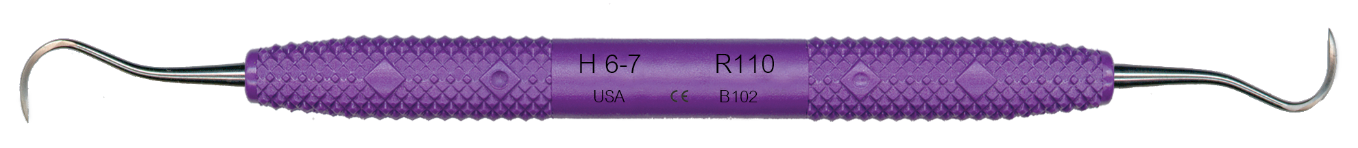 PDT Cruise Line H6-7 DE Scaler is for use in the anterior, interproximal, and premolar areas of the mouth. PDT instruments are ideally weighted, featuring the most ergonomic handle with knurling to the instrument shank to provide increased comfort with less hand fatigue and pinch. PDT’s focus on ergonomics greatly reduces the development of musculoskeletal disorders. 6 1/2" long. 3/8" Diameter Resin Purple Handle.